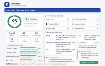 De Rankoom Website Authority Checker is een handige Chrome-extensie die gebruikers in staat stelt om de autoriteitsscore van elke website te schatten op basis van zichtbare SEO-indicatoren. Deze tool biedt directe inzichten zonder dat een account of API-sleutels nodig zijn. De autoriteitsscore, die varieert van 0 tot 100, wordt berekend op basis van zes gewogen factoren, waaronder inhouds lengte, linkstructuur en technische signalen. Hierdoor kunnen gebruikers snel de SEO-prestaties van een pagina beoordelen.